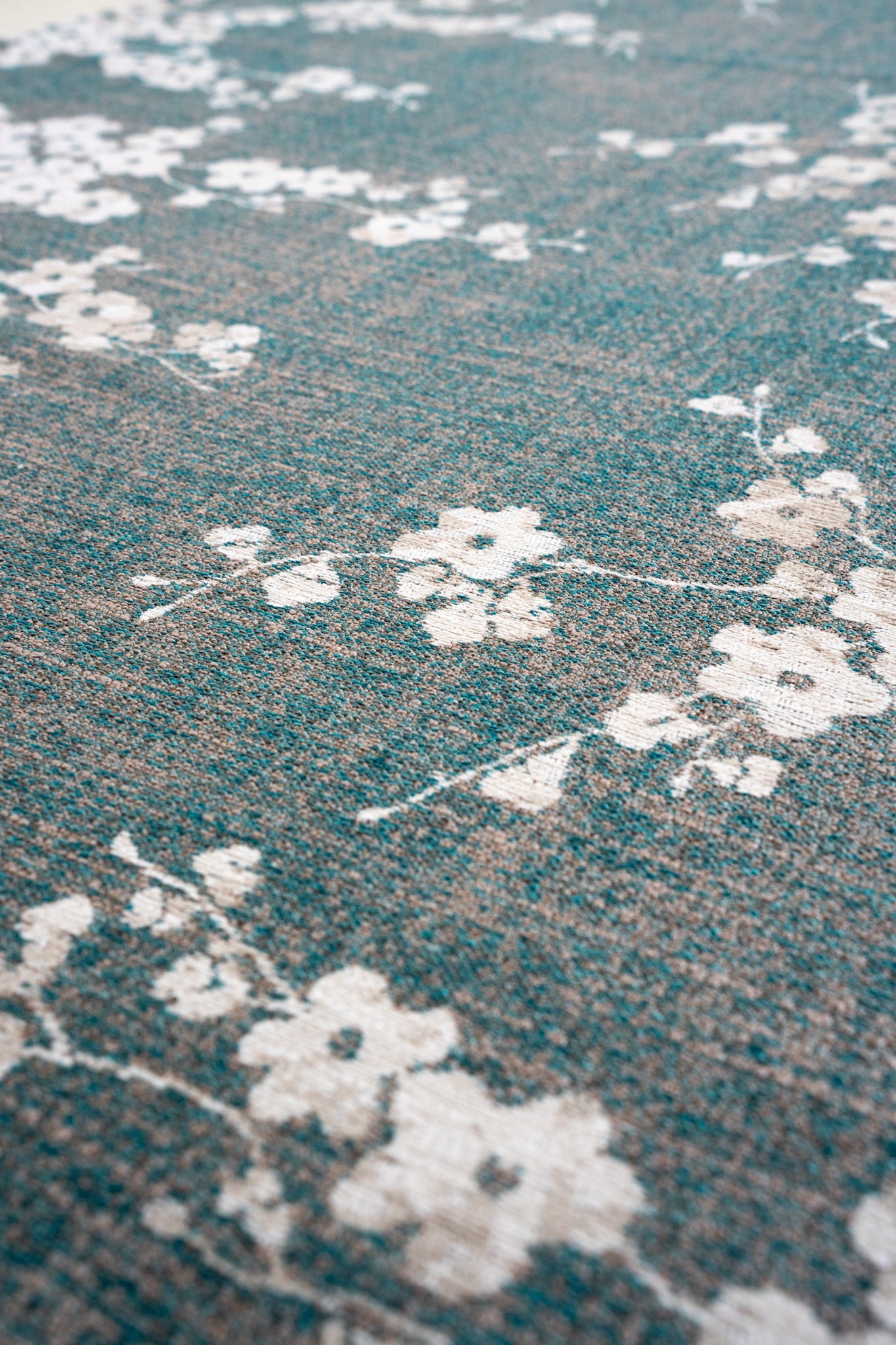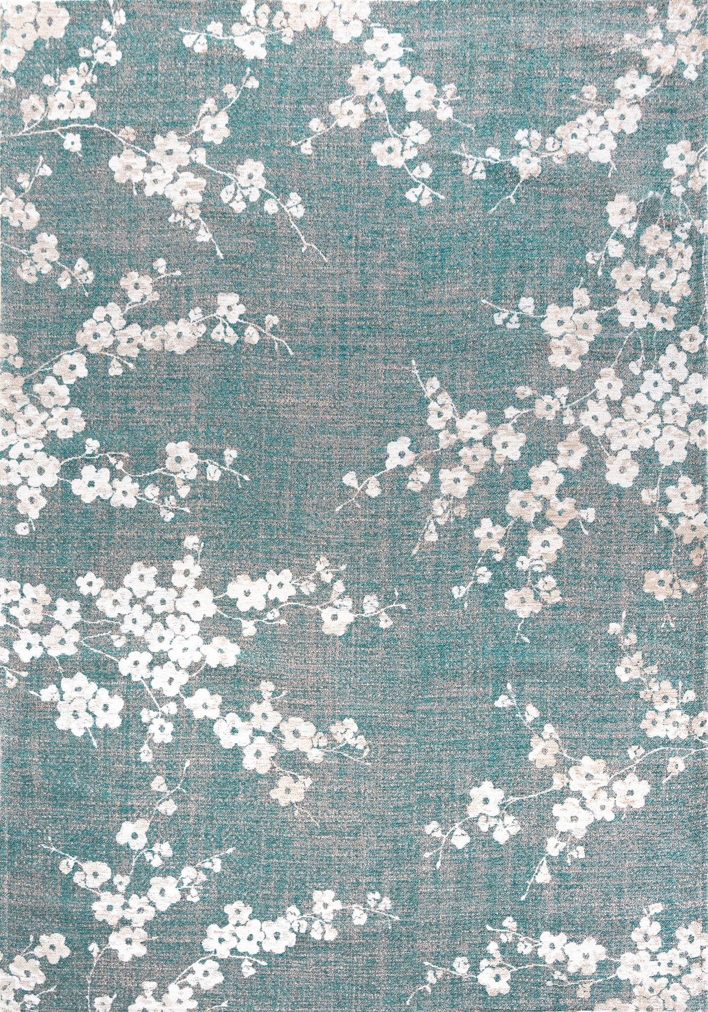 Drawing inspiration from Japanese cherry blossoms, this rug features an intricate pattern of soft white floral branches gracefully set against a serene lake blue backdrop with subtle beige undertones. The gentle distressing adds a vintage charm, giving the design a sense of depth and movement.