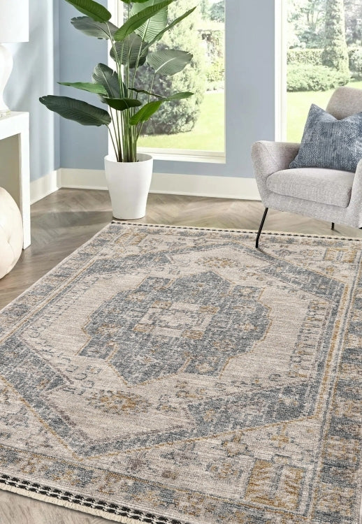 Featuring a beautifully faded central medallion in soft blue and neutral tones, this rug blends vintage charm with modern versatility. The delicate cotton fringe adds an authentic finishing touch, enhancing its classic appeal.