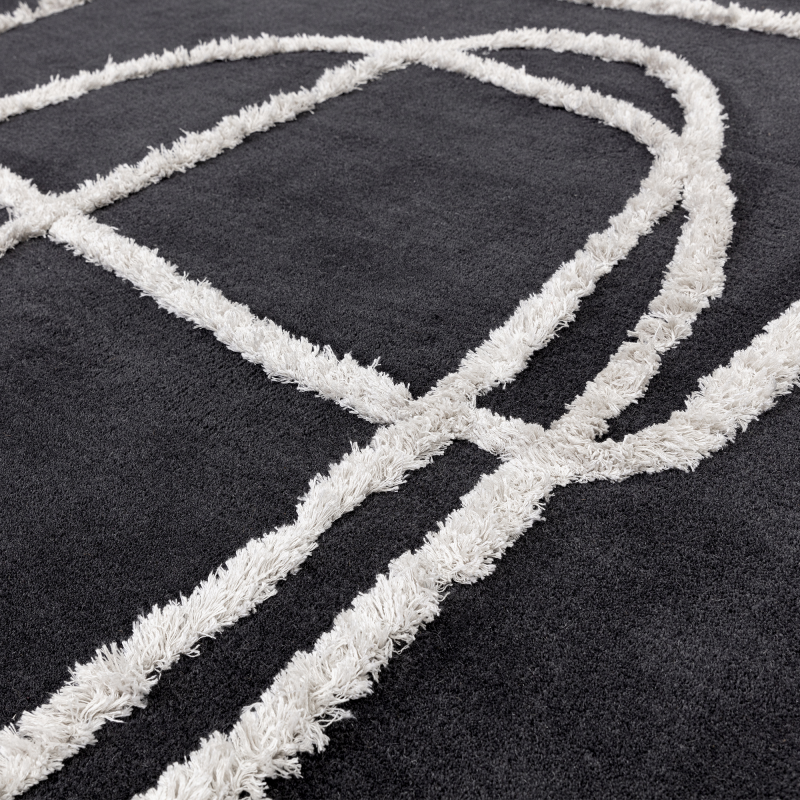 Perfect for sleek urban interiors, industrial-inspired spaces, or monochrome styling, this rug grounds a room with its dramatic base colour while the flowing lines soften the overall look. Pair it with modern furniture, metallic accents, or natural textures for a sophisticated finish.