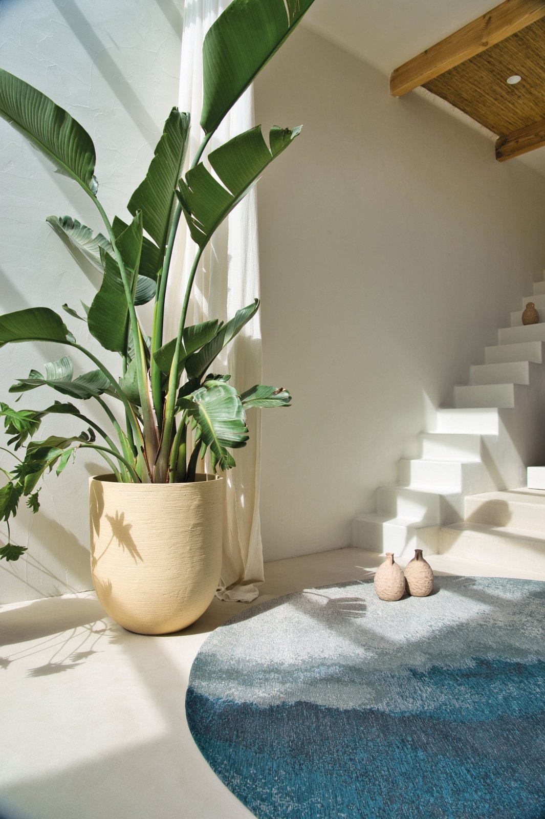 The round shape enhances the rug's sense of balance, making it a perfect centrepiece for living rooms, bedrooms, or open-plan spaces. The Inkjet palette adds depth and sophistication, ideal for modern, industrial, or coastal interiors seeking a bold yet calming statement piece.