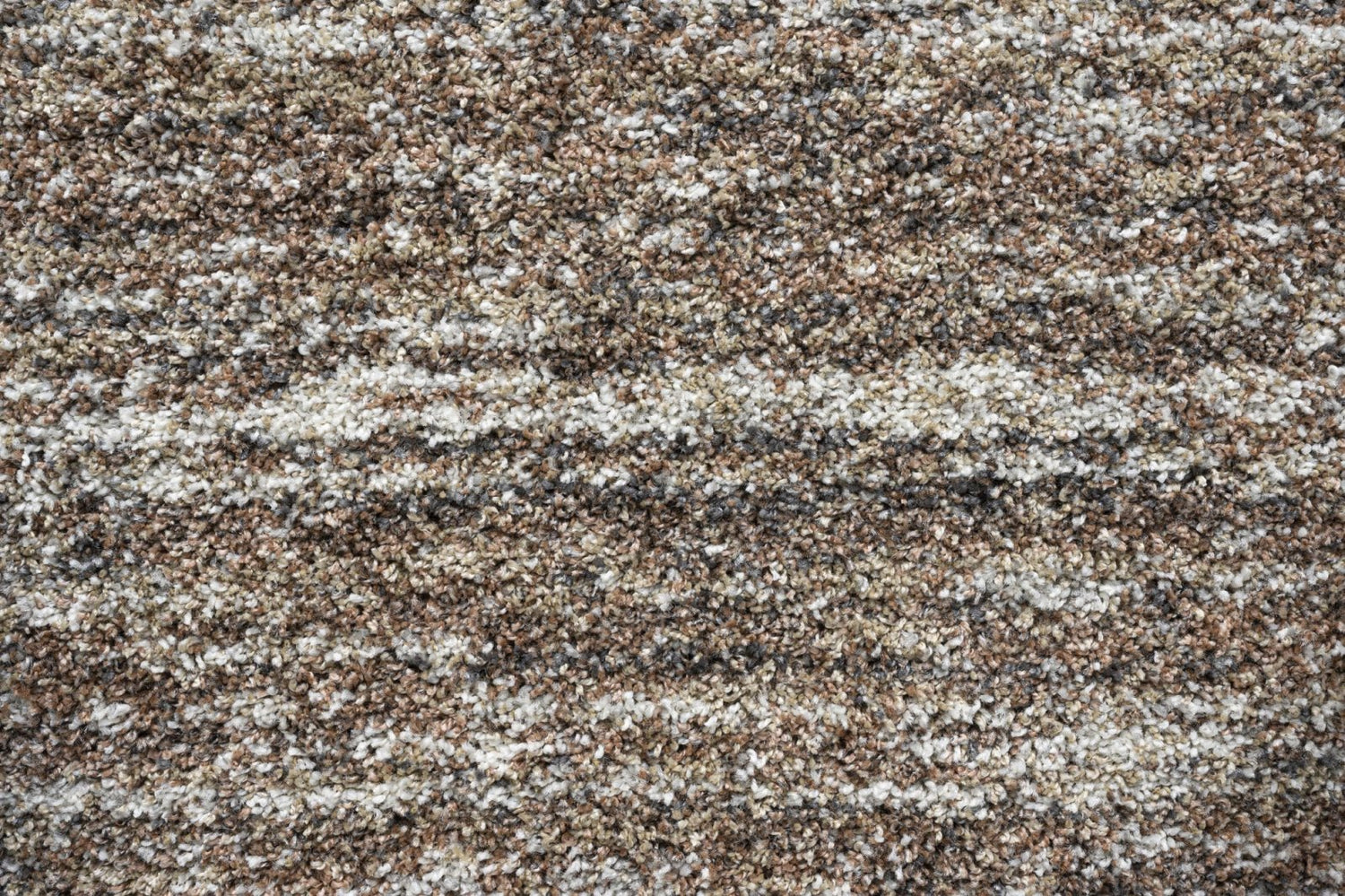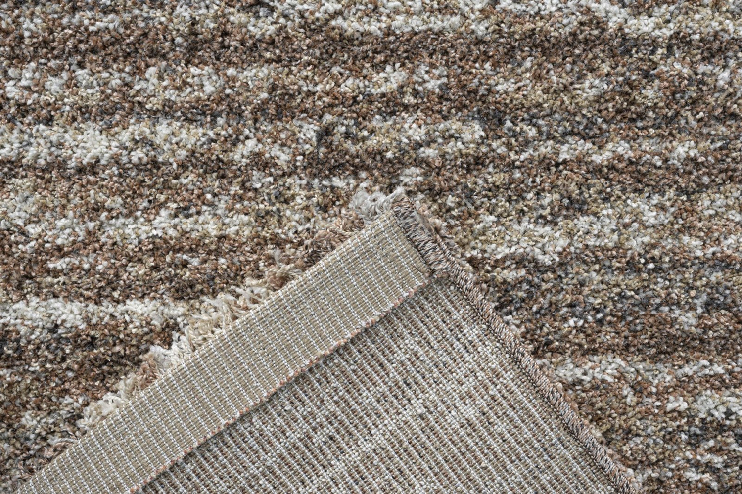 The Mehari 023-0067-8727 Rug features a beautifully blended palette of warm browns, soft creams, and muted greys, arranged in a subtle striated pattern. This understated design gives the rug a natural, organic feel, making it a versatile foundation for a variety of living spaces.