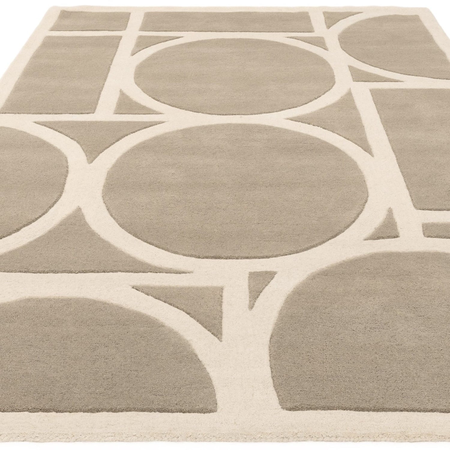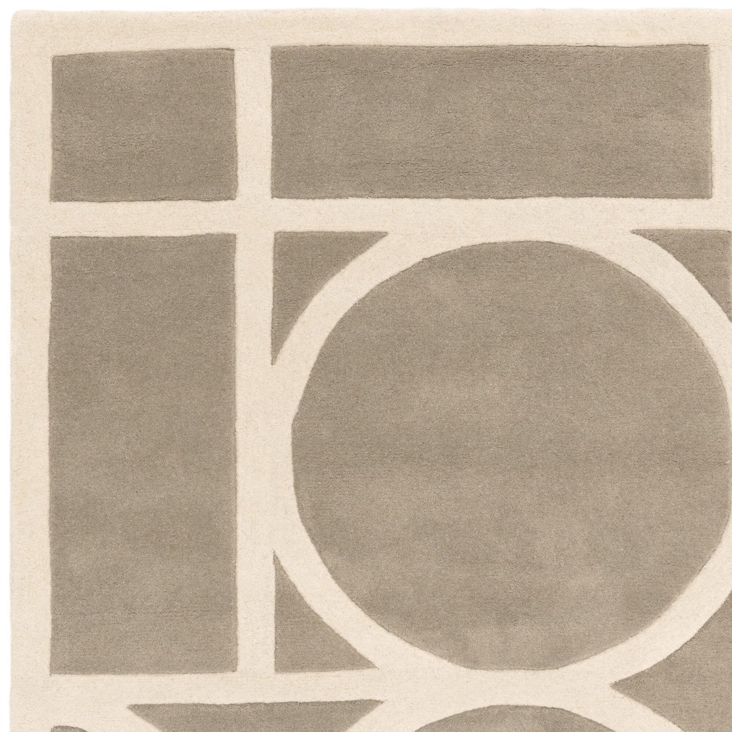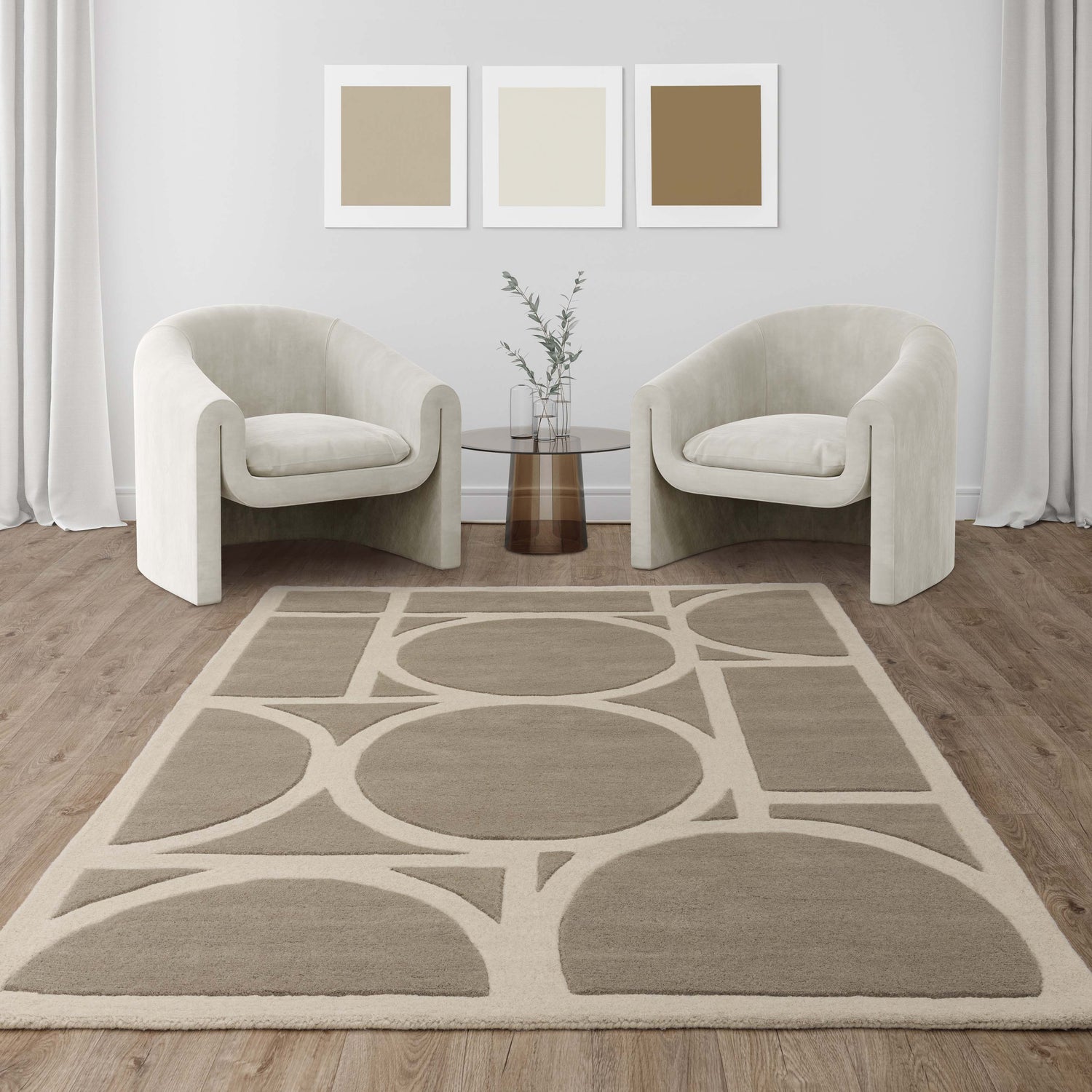 The Metro Taupe Rug features a delicate hand tufted wool pile, carved to create a multidimensional effect surrounded by bordered, geometric patterns in contrasting tones.