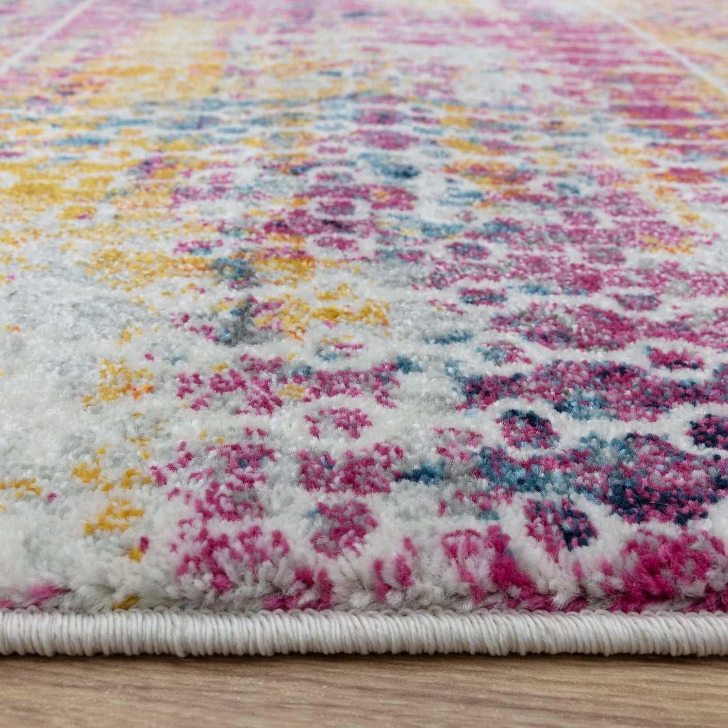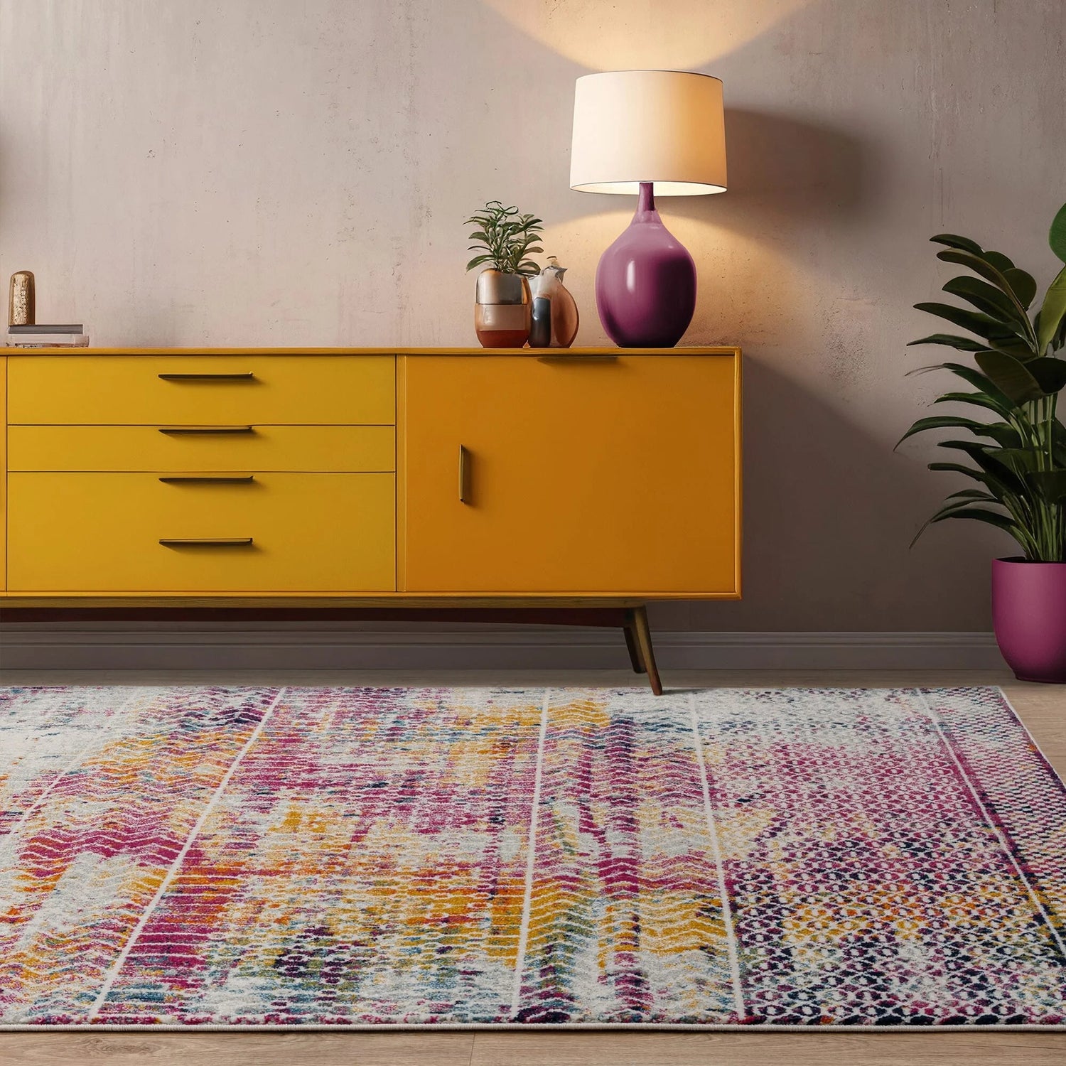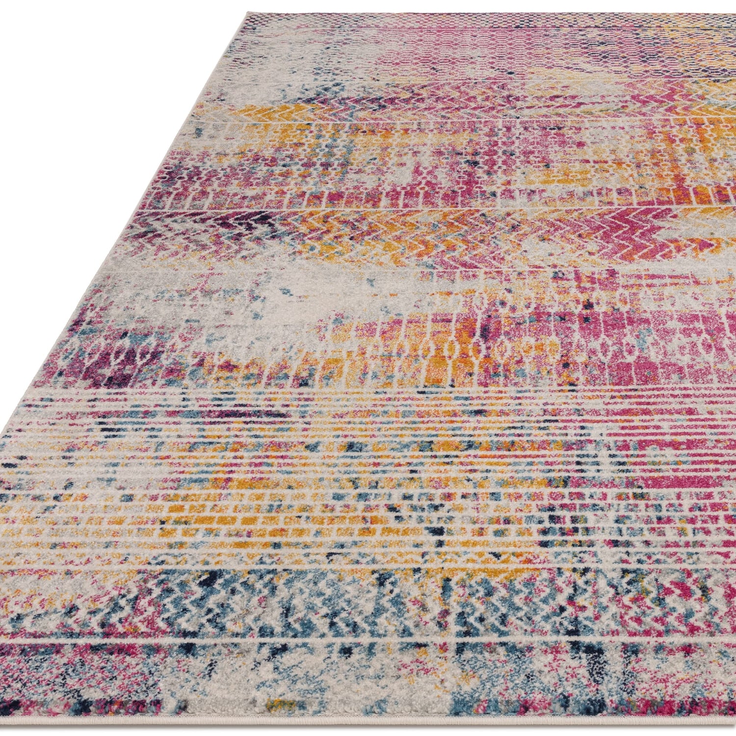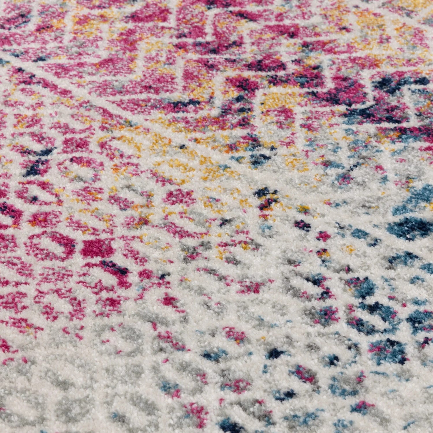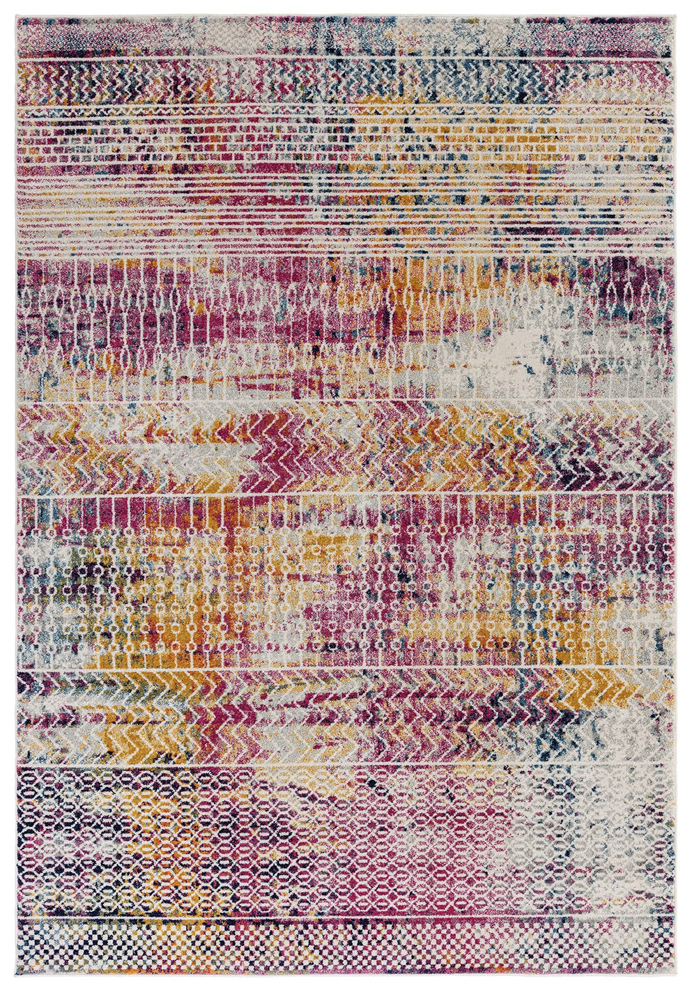The Muse MU26 Tribal Bright Rug is a bold fusion of colour and pattern, blending global-inspired motifs with a vibrant, modern palette. Machine-woven from 100% polypropylene, it features layered tribal and geometric patterns in rich tones of magenta, mustard, navy, and ivory.