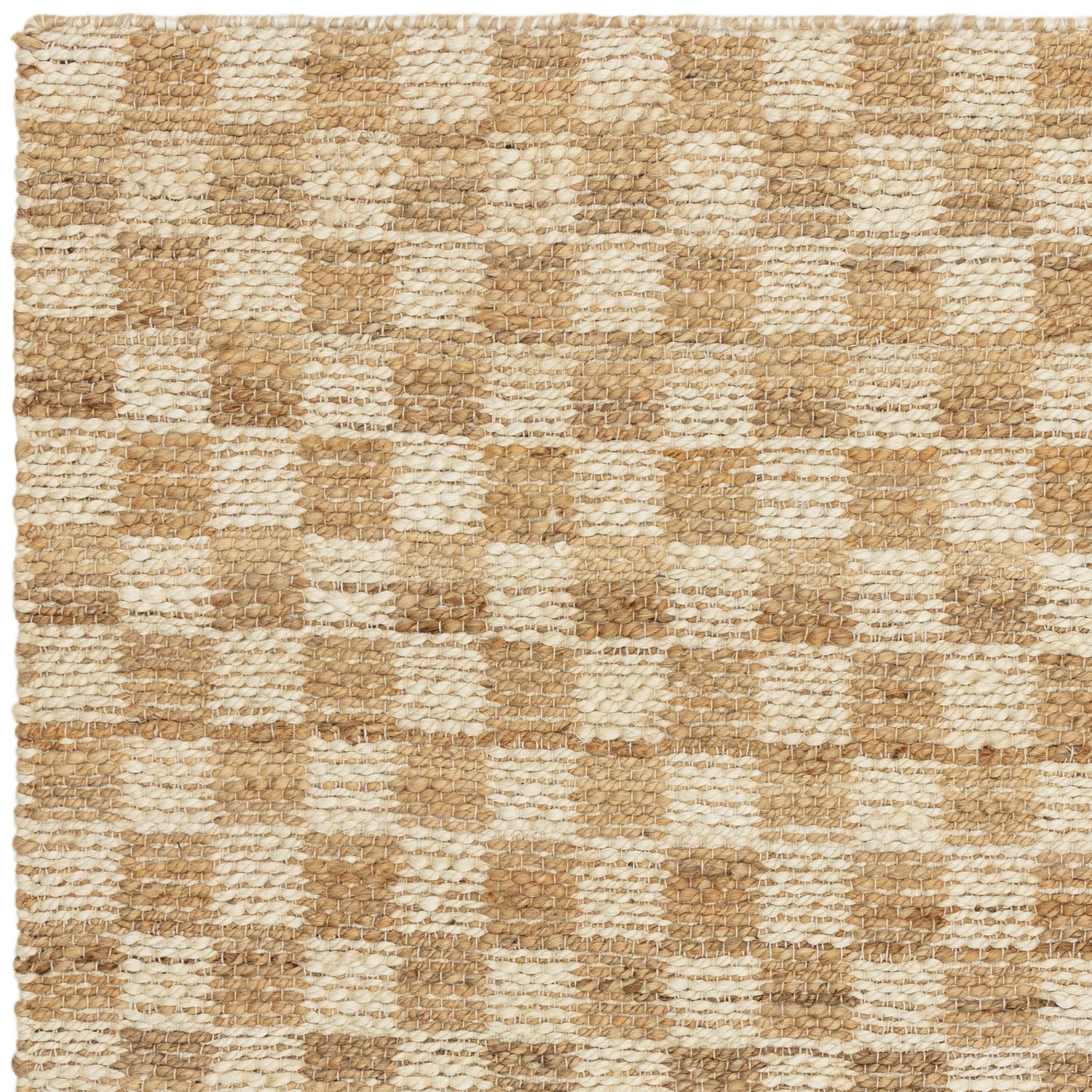 Hand-woven in a fully reversible style, the rug is crafted from a 96% jute and 4% cotton blend that keeps it lightweight yet durable. The tactile weave shows gentle variation across each square, giving the design a relaxed, handcrafted feel.