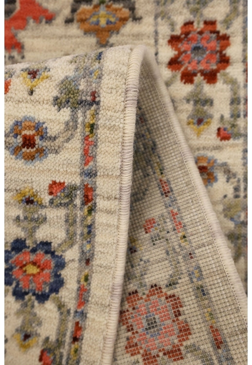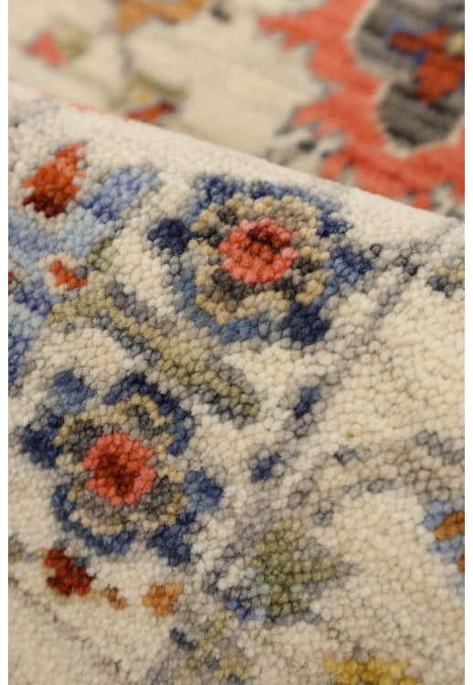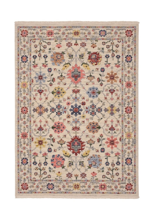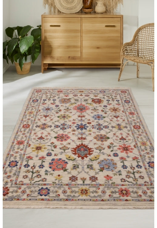 Delicate blossoms, stylised medallions, and symmetrical motifs are arranged across a soft, neutral background, creating a refined yet inviting aesthetic. Accents of red, blue, gold, and muted pastels add warmth and vibrancy, making this rug a versatile addition to both classic and eclectic interiors.