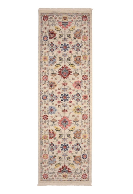 Delicate floral motifs and stylised medallions are beautifully arranged along its length, creating a harmonious and symmetrical composition that enhances any hallway or narrow space. Set against a soft, neutral background, the rich accents of red, blue, gold, and muted pastels bring warmth and depth to the design.