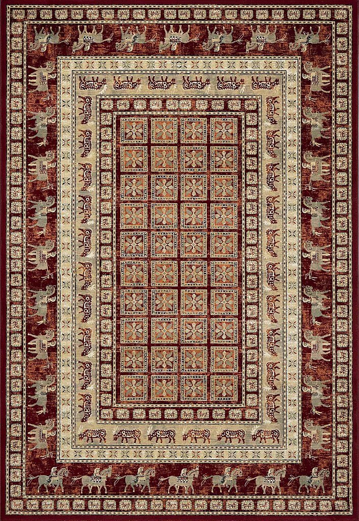 The Noble Art 65106-390 rug is a bold and eclectic take on traditional design, featuring a distinctive patchwork-style centre framed by multiple ornate borders. The rich burgundy field is adorned with a charming parade of stylised horses and elephants in earthy tones of sage, tan, and ivory, adding character and cultural flair to the piece. Geometric motifs and intricate patterning lend a structured, almost tribal feel, giving this rug a truly unique presence.