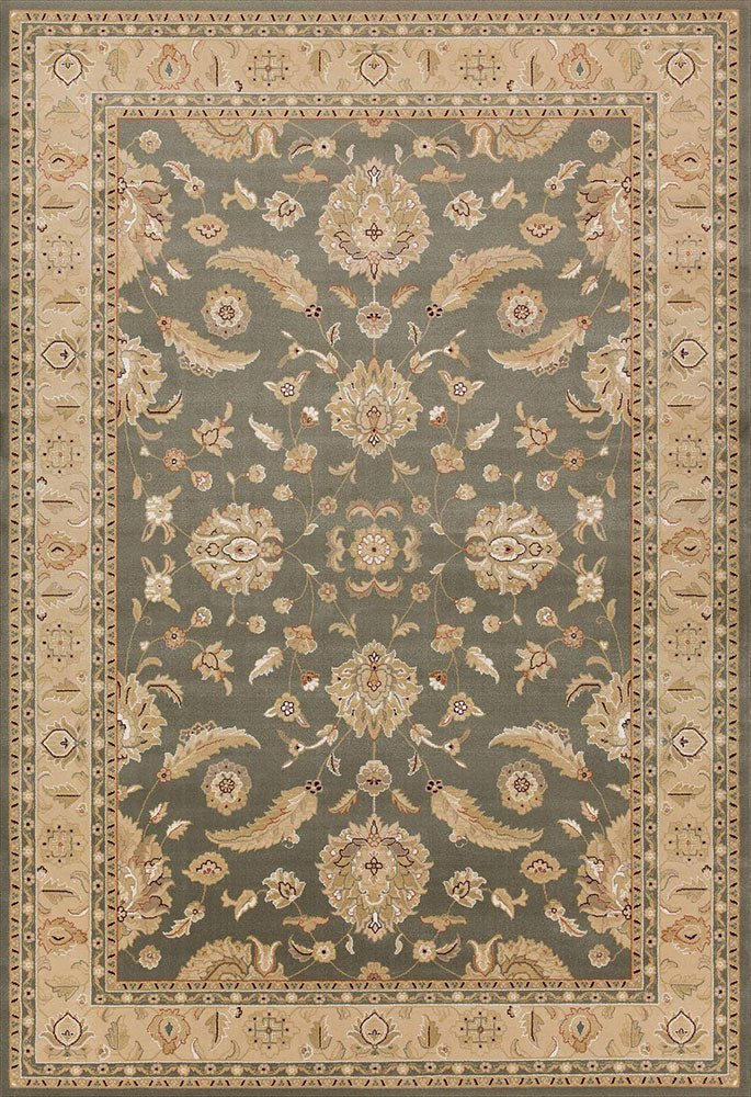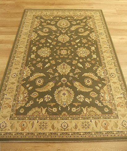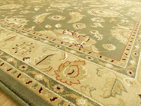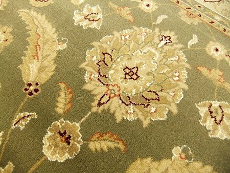 The Noble Art 65124-490 rug brings a refined depth to traditional interiors with its mossy green base and classic floral layout. Ornate motifs in warm gold, ivory, and soft rose sweep across the surface in a symmetrical arrangement, drawing the eye inward to the central medallion. A beige border, decorated with elegant scrollwork and floral accents, provides a gentle contrast that frames the design beautifully.