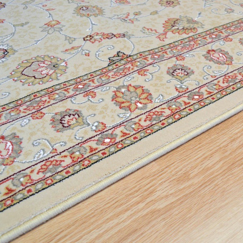 Elegant and light-filled, the Noble Art 6529-190 rug features a soft cream background adorned with flowing floral and vine motifs in warm beige, gold, and muted rose tones. The symmetrical design creates a sense of harmony and openness, while the coordinating cream border, decorated with classic rosettes and fine detailing, adds a subtle frame that enhances its traditional charm.