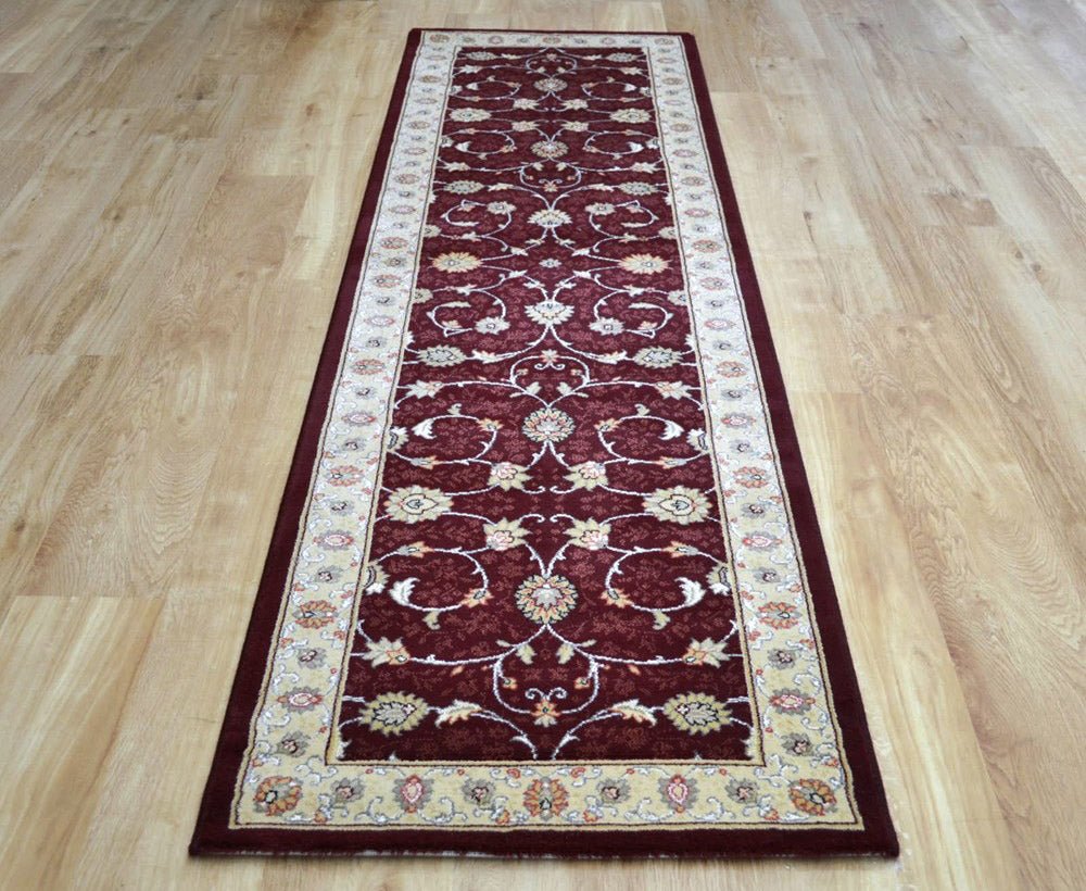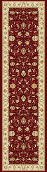 Rich and elegant, the Noble Art 6529-391 runner rug features a deep ruby red background adorned with a flowing arrangement of classic floral motifs in soft gold, ivory, and sage. The symmetrical vine design offers graceful movement, while the creamy border with traditional rosettes and scroll detailing frames the piece with timeless charm.
