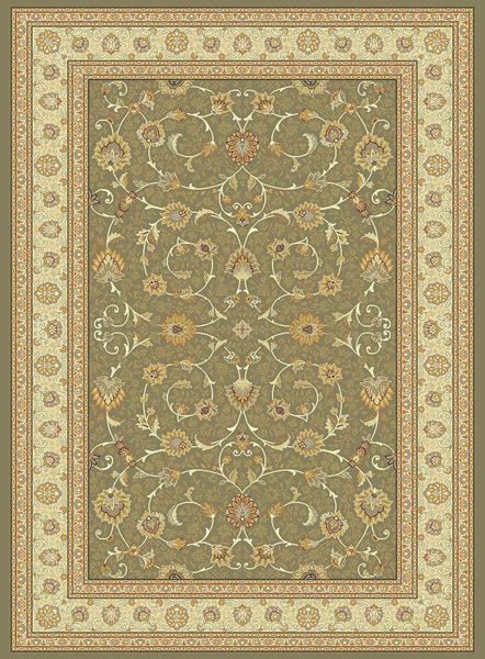 Rich in tone and traditional in design, the Noble Art 6529-491 rug features a soft olive green field adorned with elegant swirling vines and floral motifs in warm terracotta, ivory, and muted gold. The symmetrical layout brings balance and flow, while the light cream border, intricately detailed with classic rosettes, provides a crisp, refined frame that enhances the overall elegance.