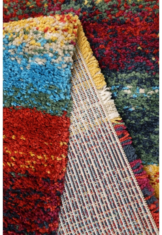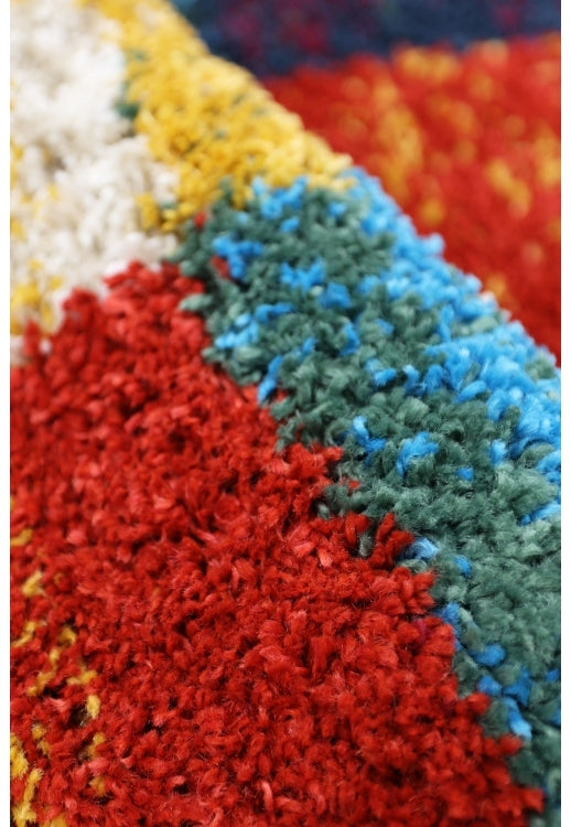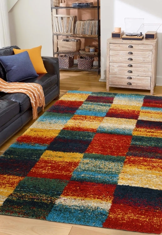With a mix of red, blue, yellow, green, and deep navy hues, this rug creates a dynamic and playful aesthetic, perfect for adding energy and warmth to a room. The textured, painterly effect within each block adds depth and character, making it a standout piece.