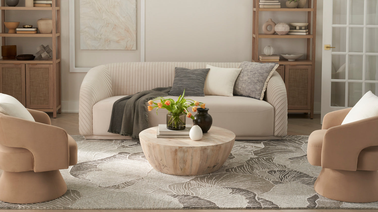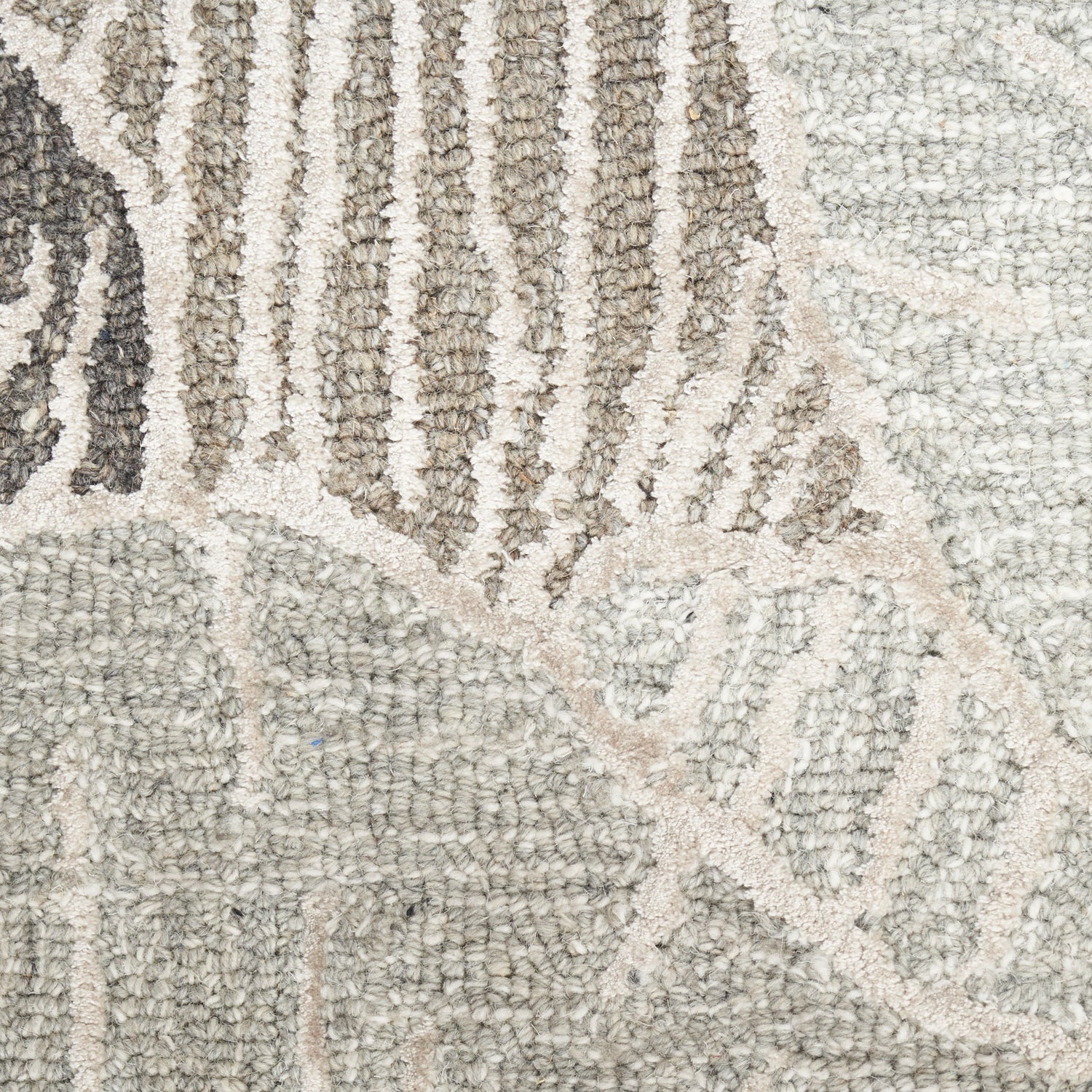 This hand-knotted masterpiece features an oversized botanical design in a sophisticated blend of grey, taupe, and ivory tones. The cut-and-loop pile enhances the texture, adding depth and dimension to the flowing pattern.