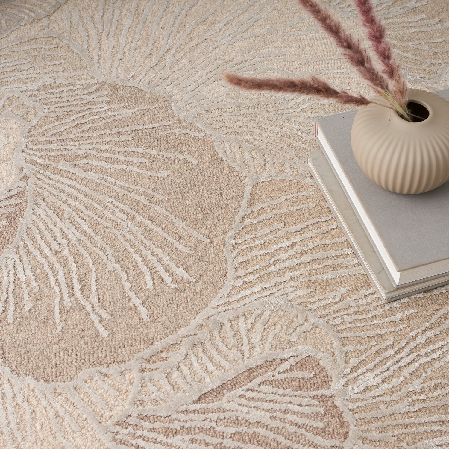 Featuring an oversized botanical pattern in soft taupe, beige, and cream tones, this hand-knotted rug offers a beautifully textured look with its cut-and-loop pile. The combination of 80% wool and 20% rayon provides a luxurious feel underfoot while enhancing the depth and dimension of the design.