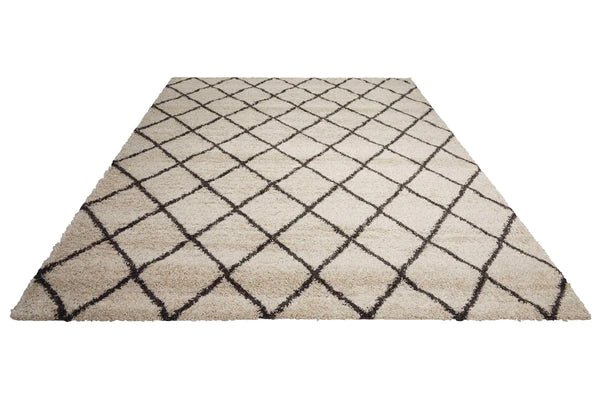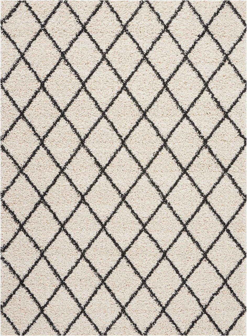 The Nourison Brisbane BRI08 Ivory Charcoal Rug features a classic Berber style diamond lattice pattern in charcoal on an ivory background, exemplifying the traditional Beni Ourain style.