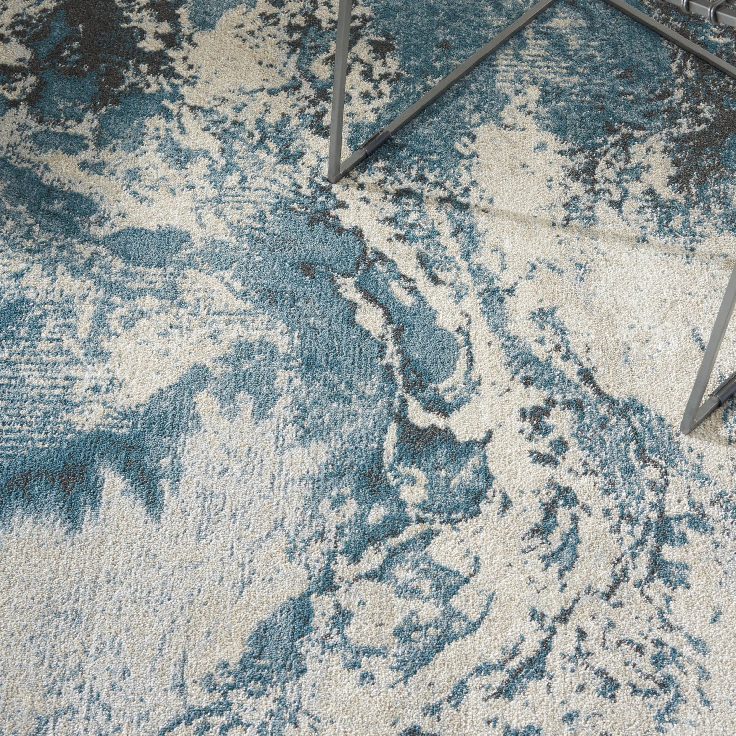 Drawing inspiration from the steady ripples of an ocean current, this abstract rug from the Maxell Collection makes a bold statement. Use it as the centerpiece for your living room furnishings, as a foundation for your home office, or a complement to your bedroom decor. With a medium-thick, 0.50 polyester pile, it feels comfortably soft underfoot. Machine-made in a multi-tonal blend of ivory, teal, and dark blue.