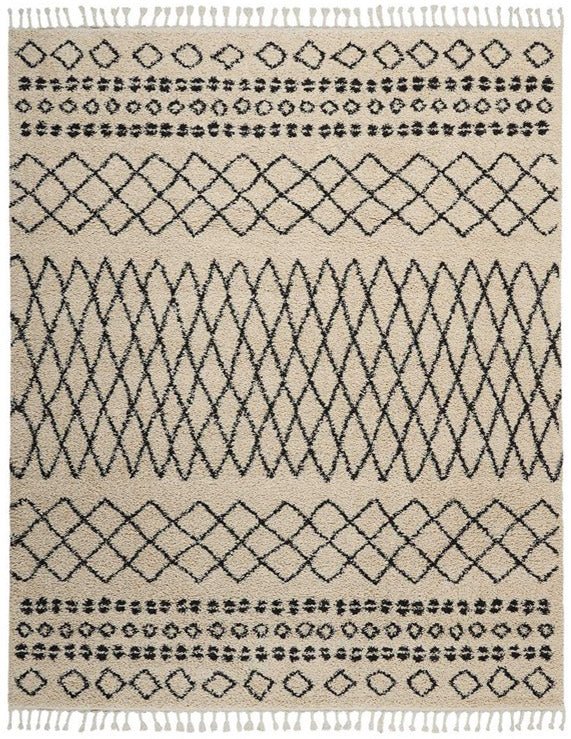 This rug showcases a harmonious blend of traditional Berber designs with a modern touch, featuring rows of geometric patterns in charcoal on a cream background. The combination of diamond and linear motifs, complemented by fringed edges, brings a sense of texture and sophistication, making it an ideal addition to both contemporary and classic interiors.