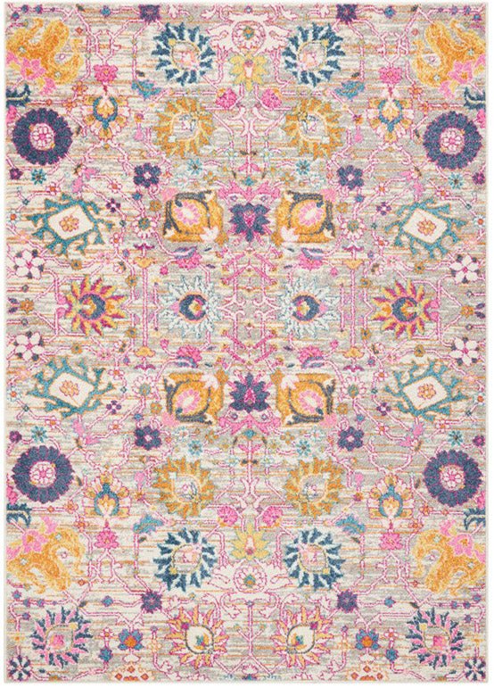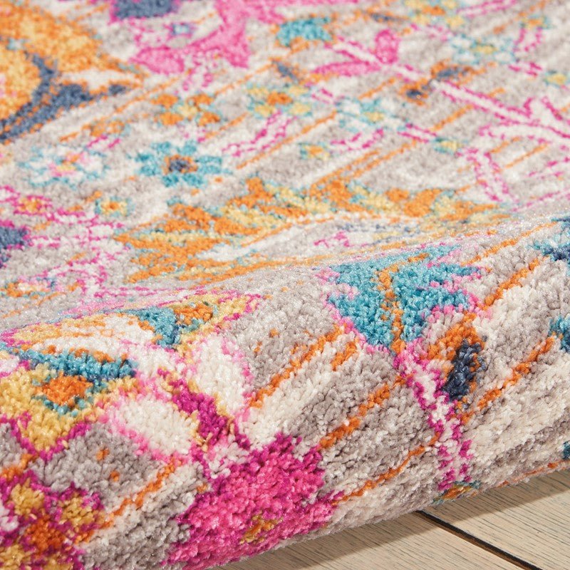 The Nourison Passion PSN01 Silver Rug brings a fresh, vibrant twist to a soft silver backdrop, adorned with intricate floral and medallion patterns in lively hues of pink, teal, gold, and violet. This cheerful yet refined palette creates an inviting focal point that brightens any room without overwhelming it.
