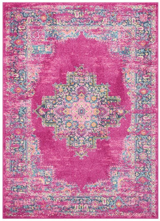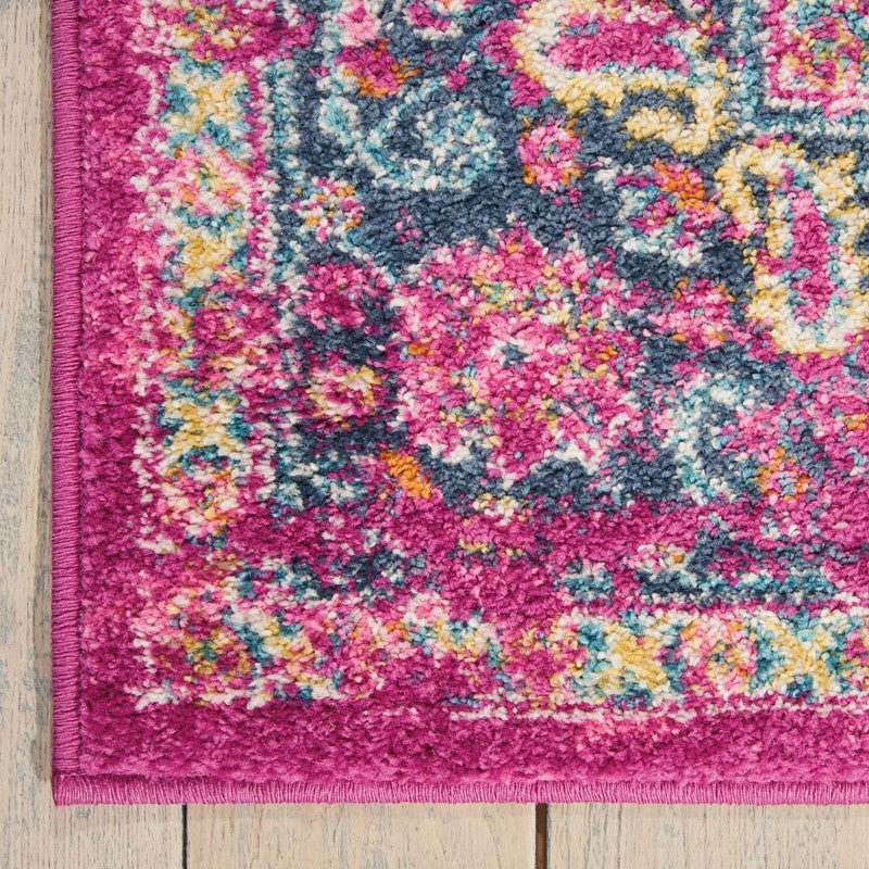 The Nourison Passion PSN03 Fuchsia Rug is a vibrant showpiece, featuring a rich fuchsia background and a detailed central medallion in shades of blue, yellow, and teal.
