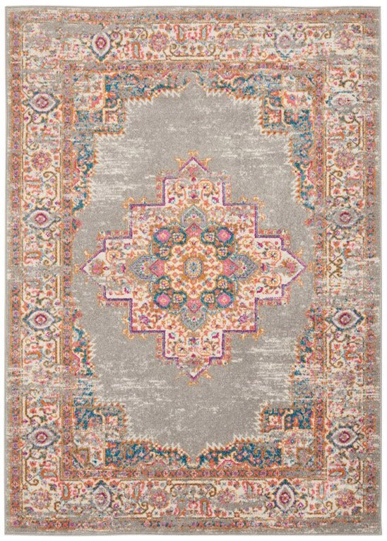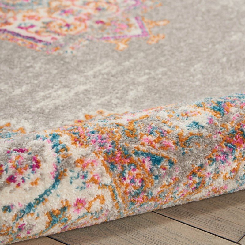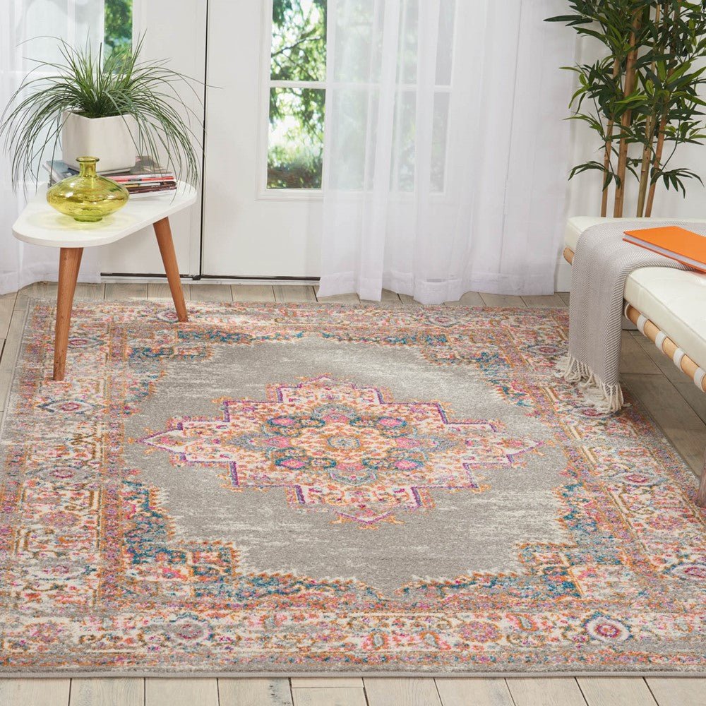 The Nourison Passion PSN03 Grey Rug brings a subtle elegance with its soft grey base and intricate medallion design in warm tones of orange, pink, and blue. T