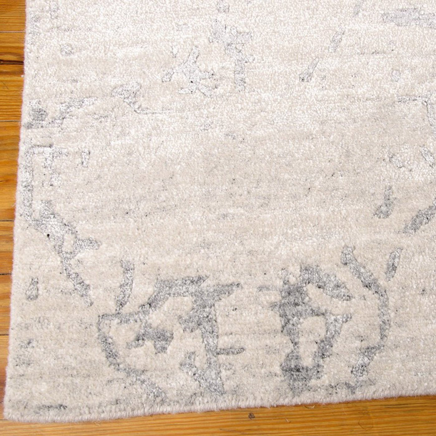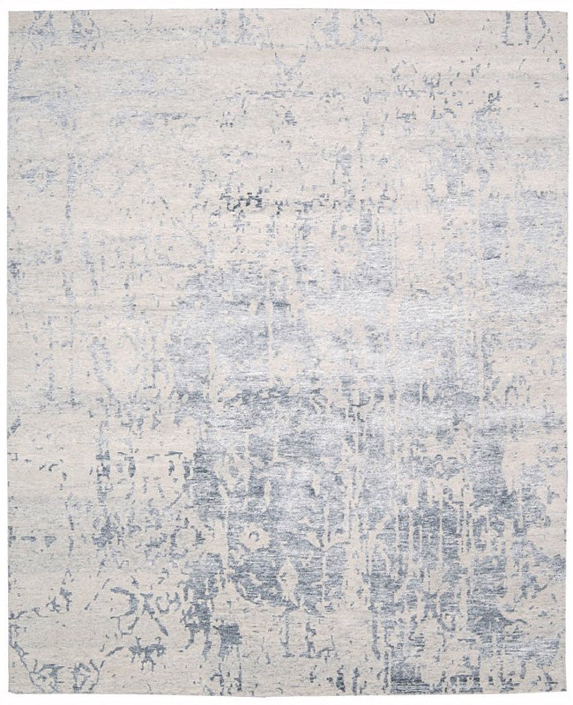 Featuring contrasting icy shades of mystical silver, a subtle abstract design and splendid shimmering highlights thanks to sensuous silk-like fibres, this mesmerizing hand-woven rug is positively magnetic in its tone, texture and dimension.