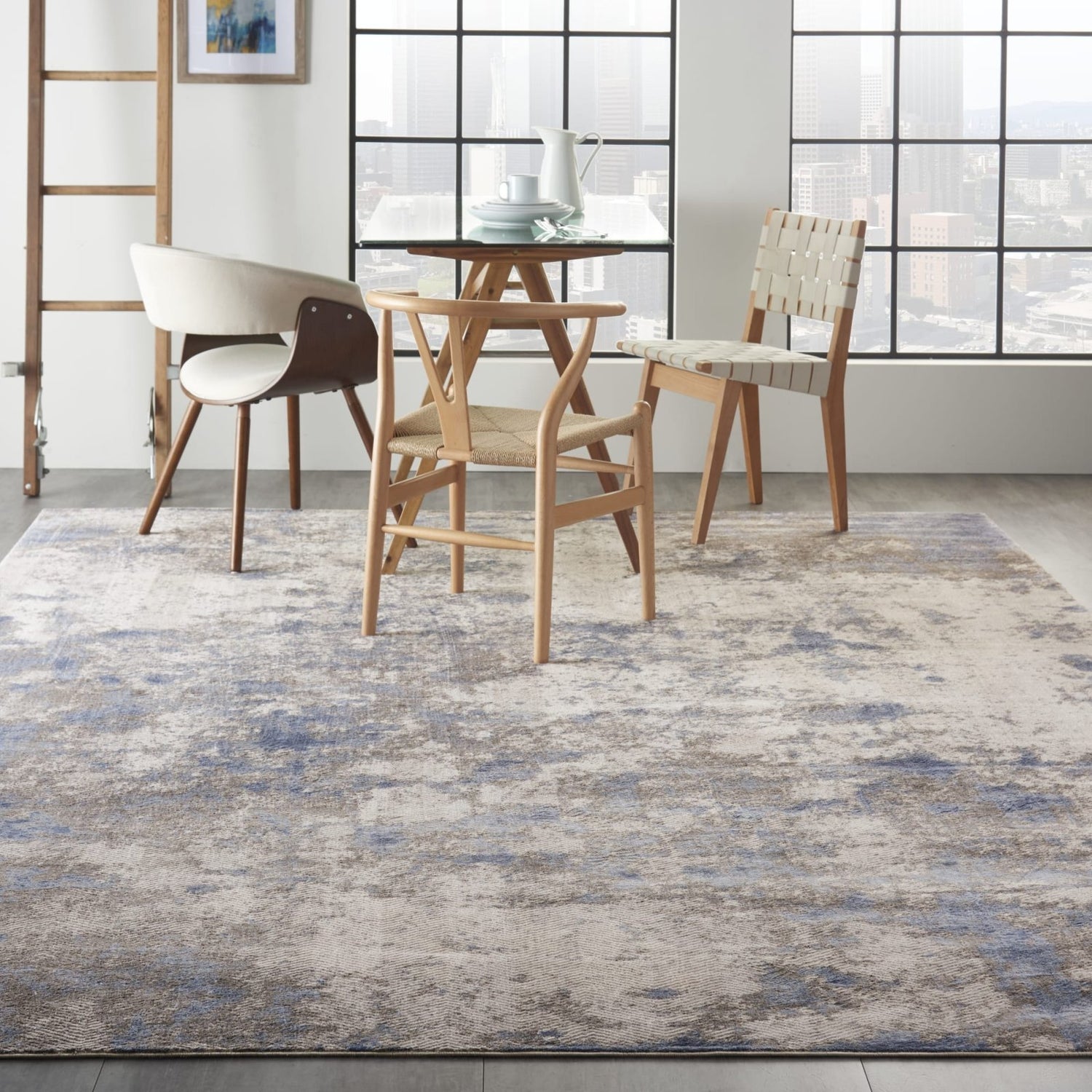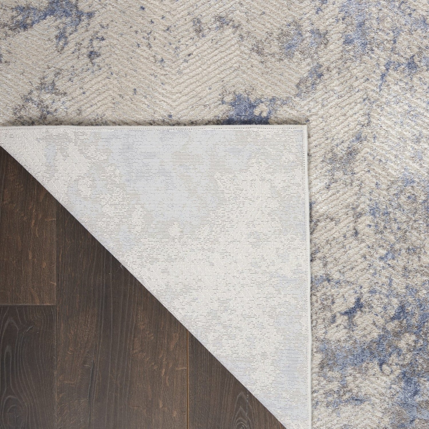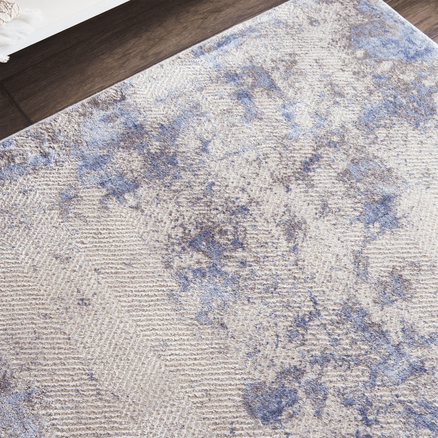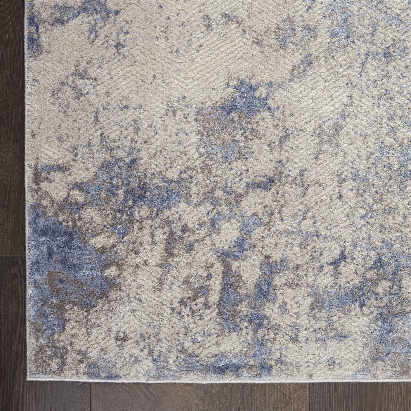 The Nourison Silky Textures SLY04 Blue Ivory Grey Rug features a calming abstract pattern with a mix of blue, ivory and grey tones.
