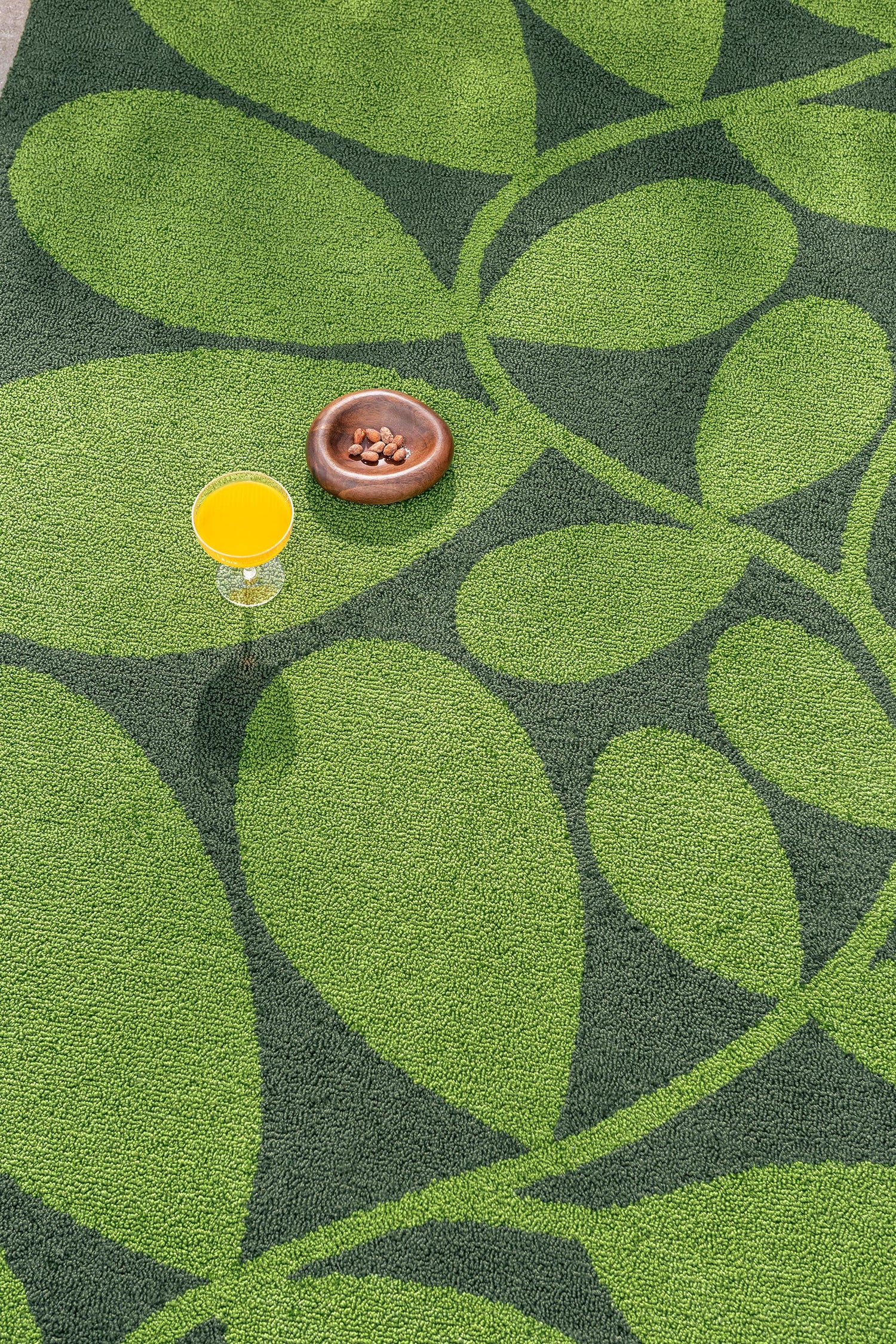 Hand-tufted from 100% recycled PET yarns, it's a durable and eco-friendly choice for outdoor living. The rich green palette feels lush and grounded, ideal for complementing natural surroundings or brightening up urban balconies.