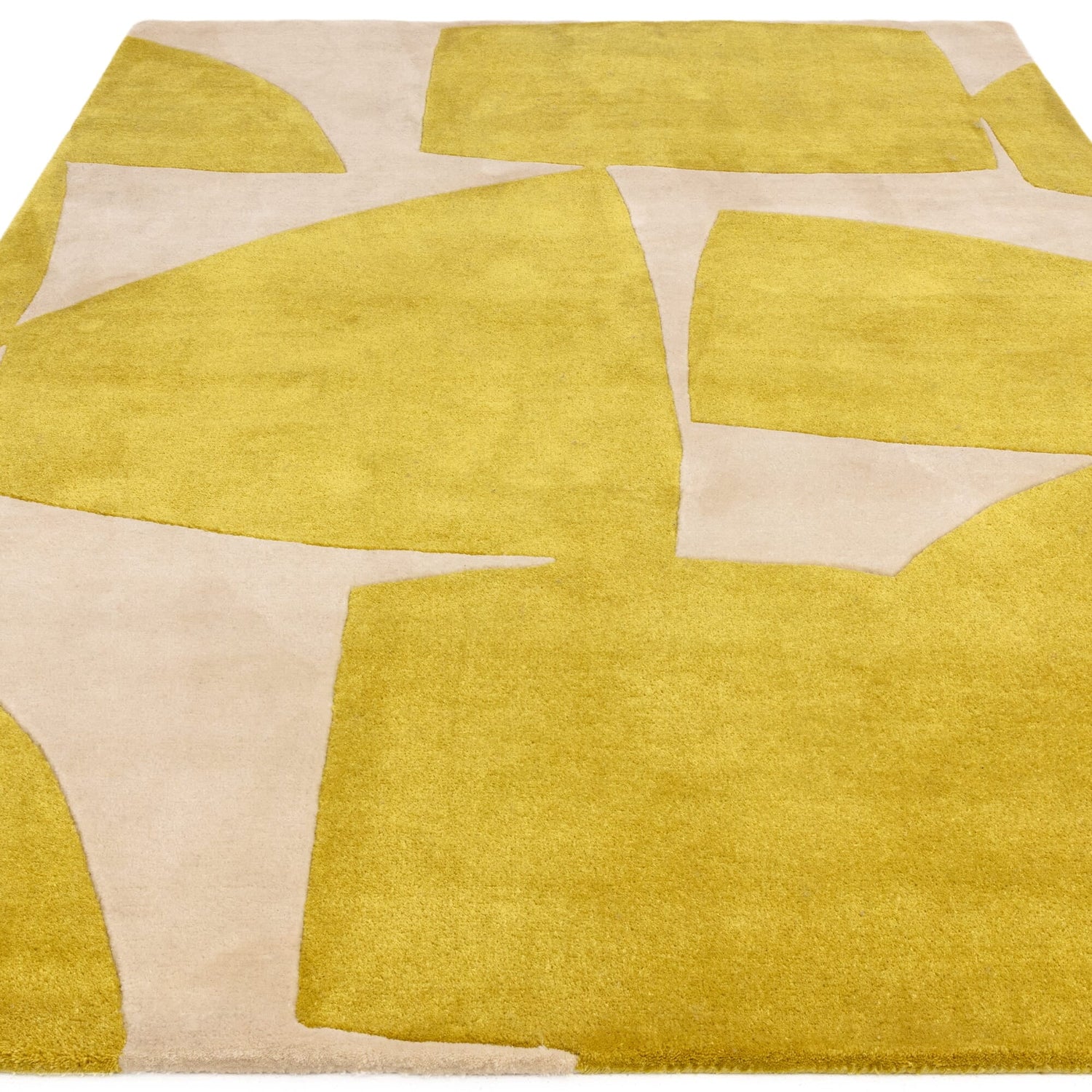 The Romy 06 Kite Chartreuse Rug features unique carved yellow shapes against a beige background. The geometric design and vibrant colour aligns with both retro and contemporary tastes.