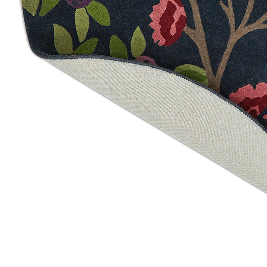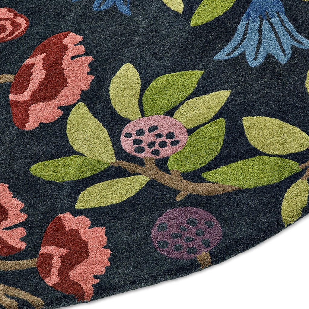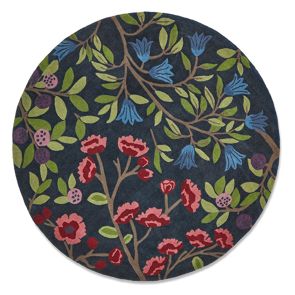 Bring a touch of the countryside into your home with the Sanderson Foraging Indigo 146618 Round Rug, featuring intricate blooms of wild berries, sloes, and blossom against a dramatic midnight indigo background.