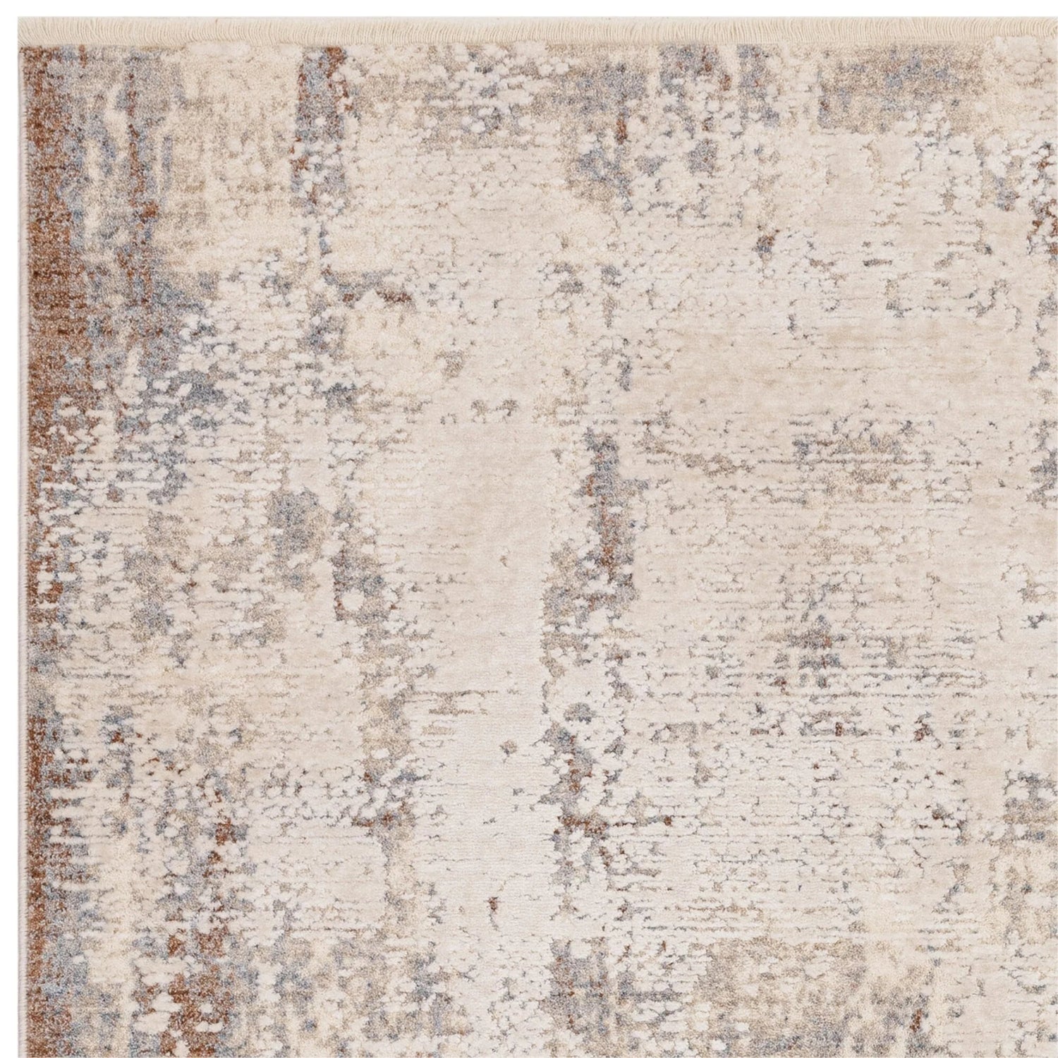 This rug features a beautifully distressed abstract design in neutral tones of cream, beige, and taupe, creating a soft, textured appearance that adds depth and warmth to any room.