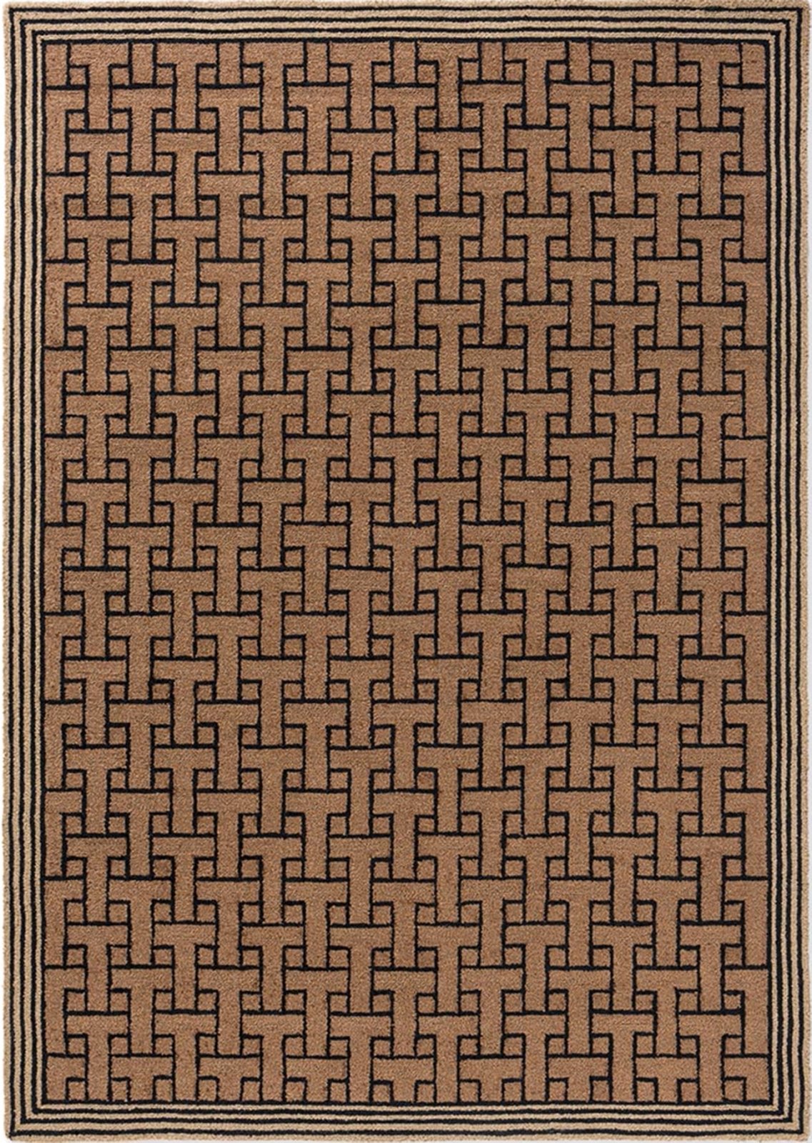 Showcasing Ted Baker’s iconic interlocking 'T' design, this rug is a celebration of the brand’s distinctive identity, cleverly crafted into a refined geometric repeat. The warm light brown base is contrasted with deep black outlines, creating depth and visual texture, all framed by a crisp striped border.