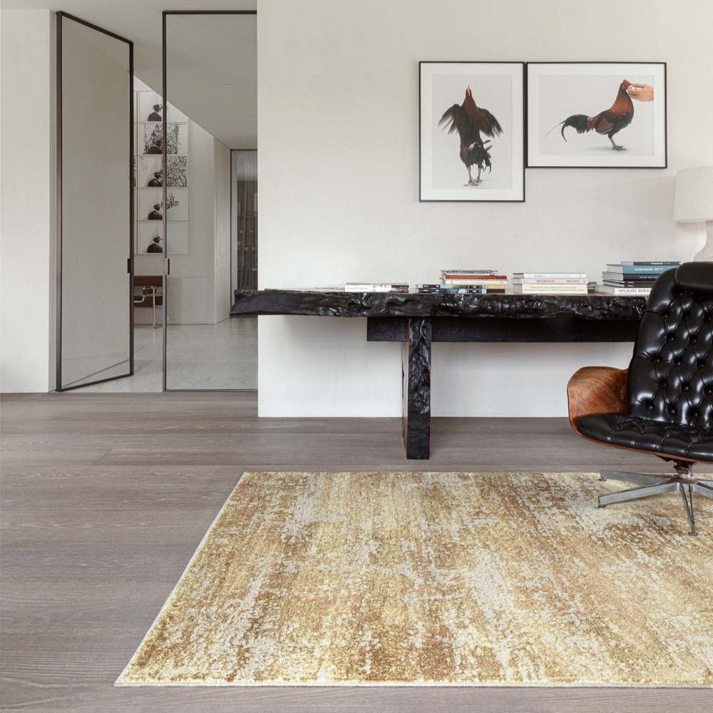 Introducing the Venus rug, in shades of gold and beige. Elegantly crafted in Europe with a luxurious high gloss finish and an abstract "cloud" pattern.