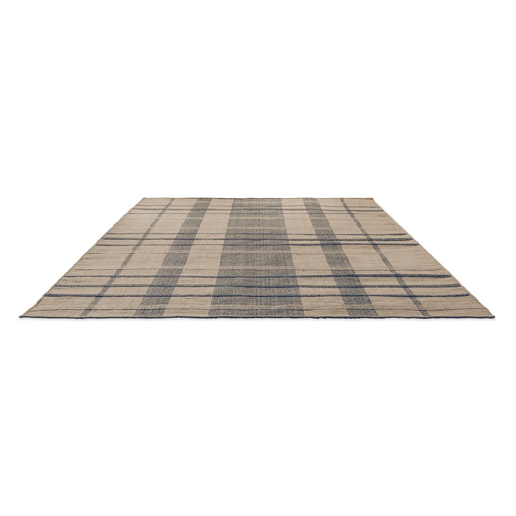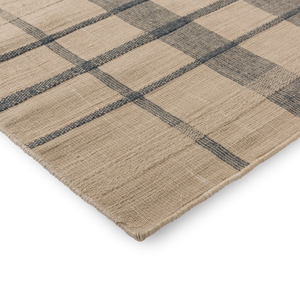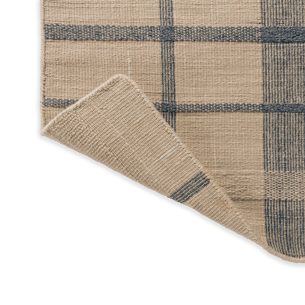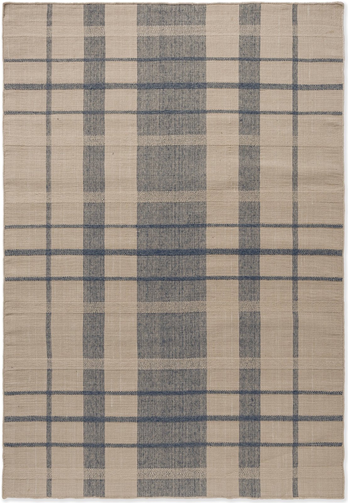 Its soft beige base is crossed with washed denim blue in a large-scale check, offering a relaxed yet tailored look. The flat weave construction adds a smooth, durable surface—ideal for outdoor living areas, garden rooms, or balconies.