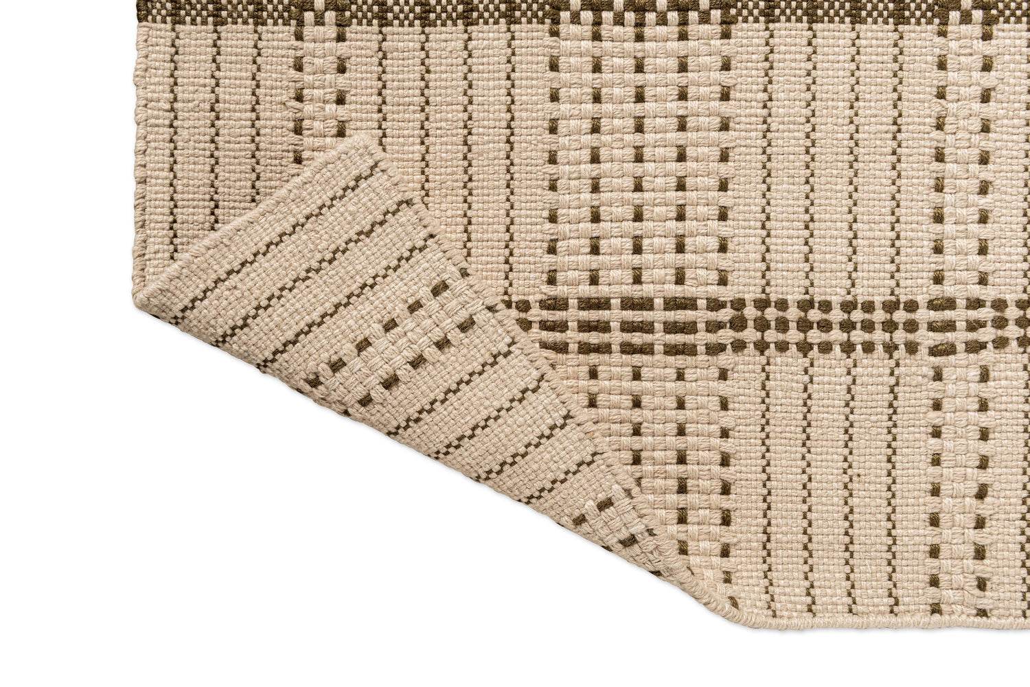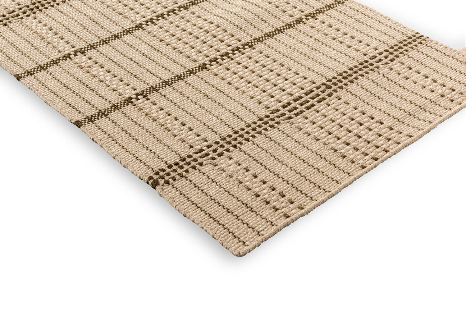 The Zona Olive Stitch runner offers a streamlined take on a classic check, softened by warm beige tones and delicate olive stitching.